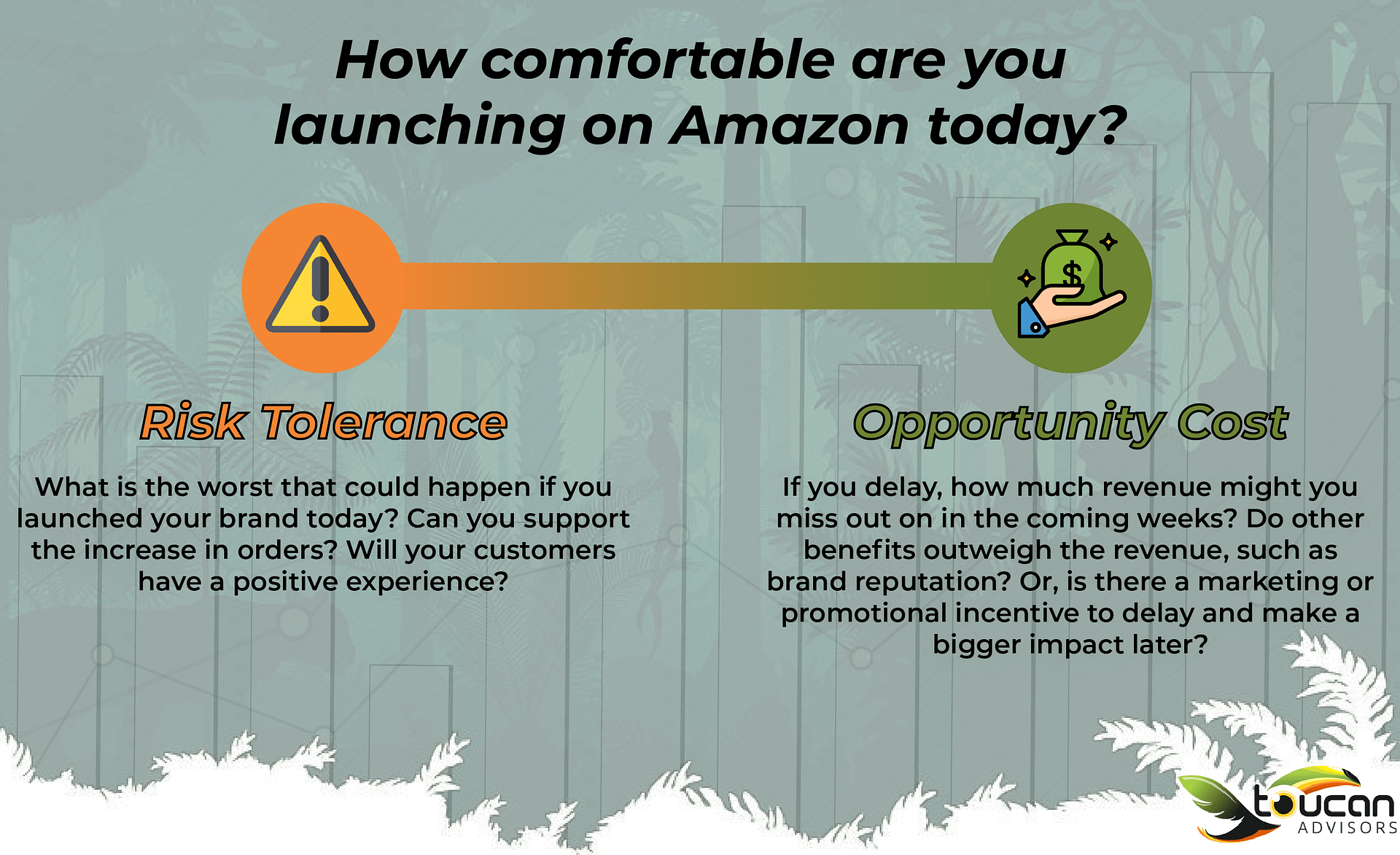 At Toucan, one of the most common challenges we help clients overcome is the evaluation of opportunity cost. In our lengthy experience, we’ve run the gamut of eager “dive-right-in” clients all the way to very detailed and extremely thorough. Every company has slightly different priorities, brand standards, and objectives. In truth, there’s no right way or wrong style for an Amazon launch. It becomes a question of risk tolerance (e.g., launching before your brand or customer experience is perfect) and opportunity cost (e.g., delaying potential revenue by focusing on granular details).