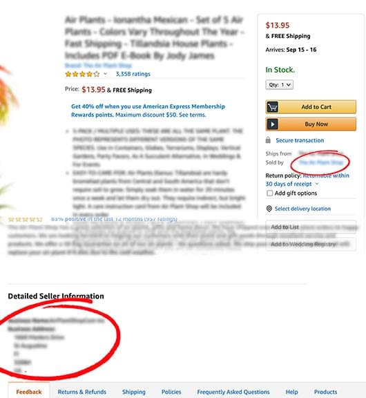 You can find a seller’s name and address by clicking on the seller name on a product page beside “Sold by”. (see image)
